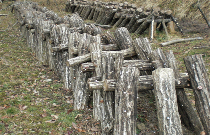 ナラ、クヌギなどの原木に穴をあけて、種駒を植えていきます。